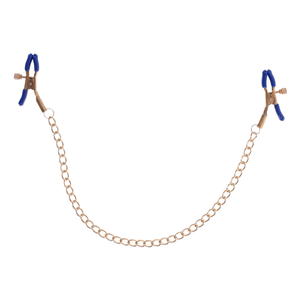 These exquisite clamps feature a gold chain and striking blue plastic tips, blending elegance with a touch of wild playfulness. Perfect for those new to BDSM or seasoned enthusiasts, the adjustable thumb-screws allow you to control the pressure, ensuring a tailored experience. The shimmering gold chain not only adds a sophisticated touch but also offers a tempting opportunity for gentle tugs as passion intensifies. Let your imagination run wild and explore the tantalising sensations these versatile clamps can bring to various parts of your body.